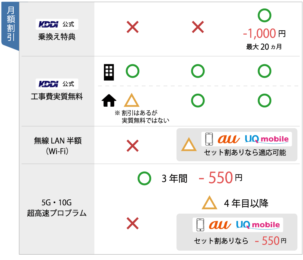 2025年11月時点では、5G・10Gは3年間月額-550円。さらにau・UQmobileのスマホセット割があるなら4年以降も月額-550円が可能です。