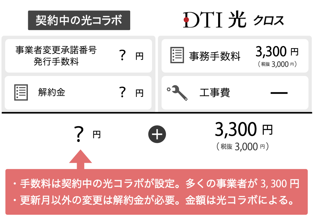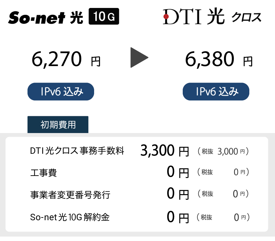 DTI光クロスに事業者変更する場合の初期費用は、基本的に下記のとおりです。