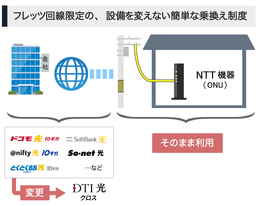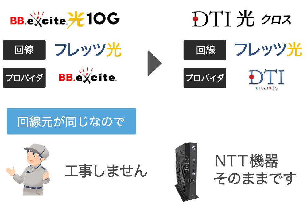 設備を継続利用する「事業者変更」で、工事することなくDTI光クロス10ギガに乗換えられます。