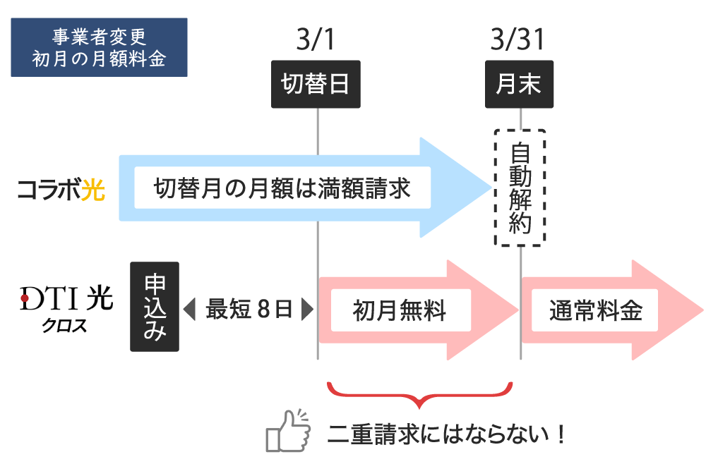 DTI光クロスの初月は無料のため、切替日の設定は月初がおすすめです。月初設定なら、初月は無料で利用できる日数が多くなるからです。