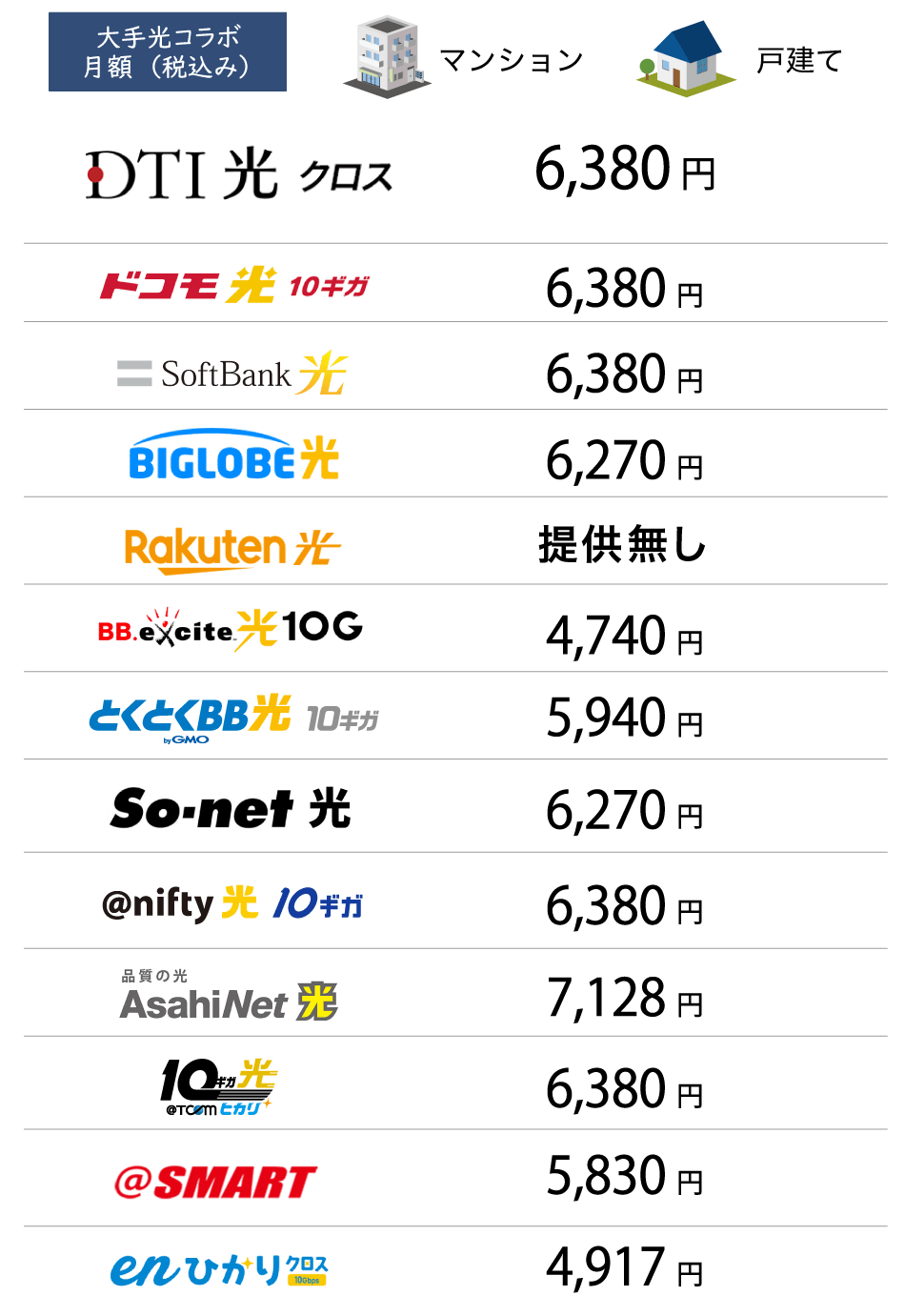 DTI光クロスの月額はプロバイダ料込みで6,380円です。マンションと戸建てで料金の違いはありません。