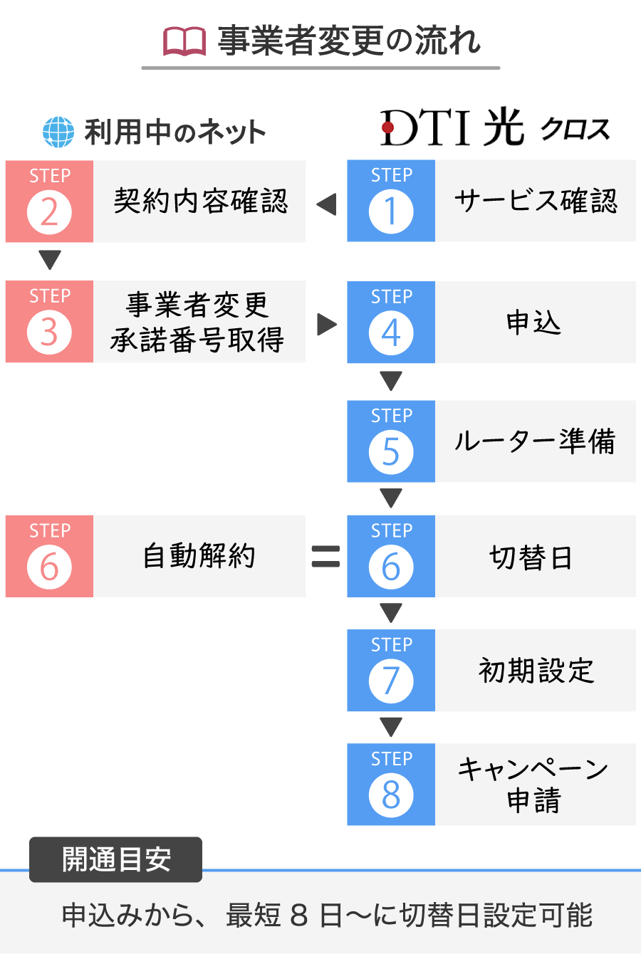 DTI光クロスへの事業者変更は8つのステップで完了します。申込み手続きとプロバイダ設定が主な内容です。