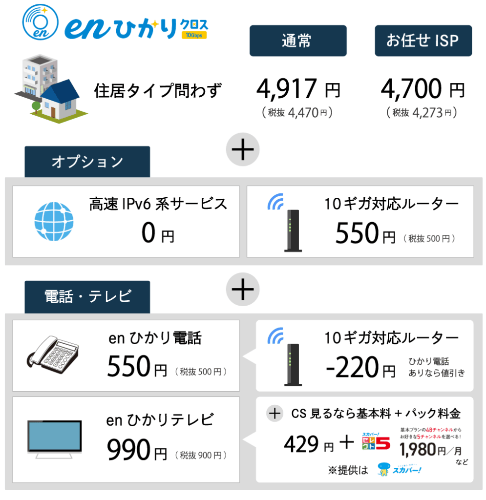 数あるNTT系10ギガでも、enひかりクロスは他社の1ギガより安い場合もあるほど低価格な月額4,917円もしくは、4,700円が魅力です。