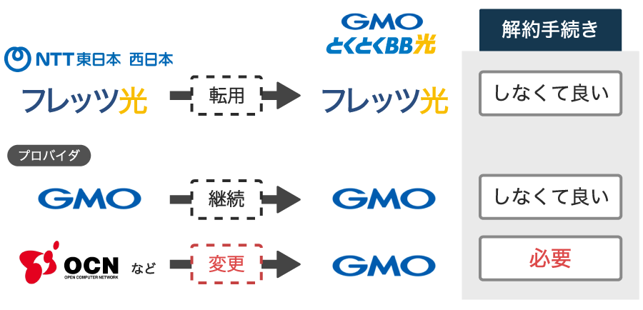 回線は引継ぎ利用なので手続きは不要です。GMO以外のプロバイダを利用していた場合は、旧プロバイダは不要になるので解約手続きをする必要があります。
