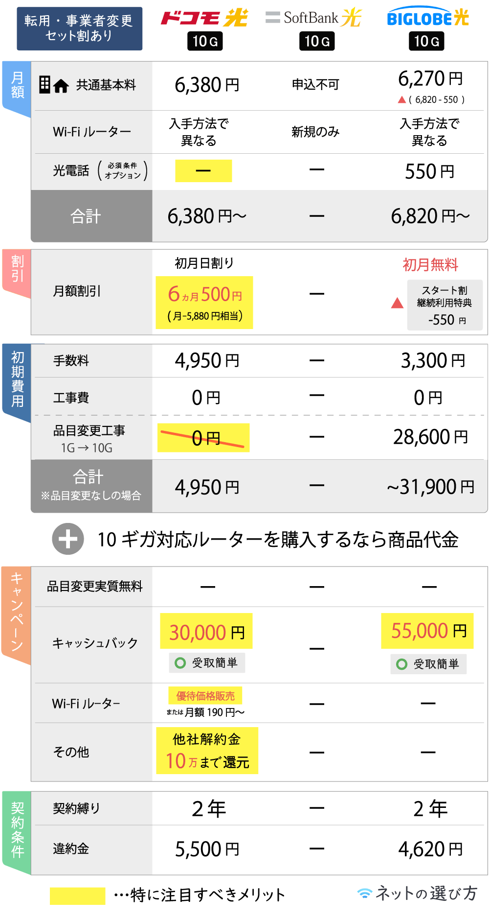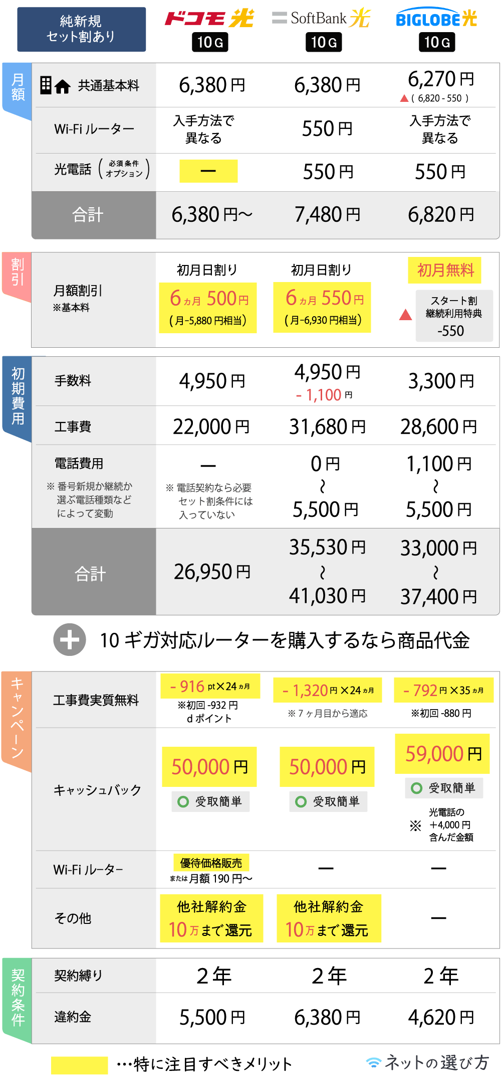 その他、キャンペーン条件や月額など総合的に判断し、ピックアップした10ギガ光コラボの方が優れていると判断。
